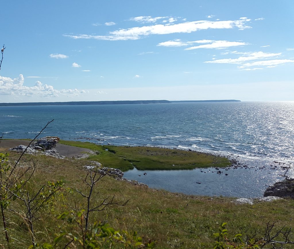 Fälten är gula. Av solen svedda. Gyllene strån vajar i vinden. Ljuset är vitt. Sommaren är i sitt esse.  Vägen går spikrakt nedåt. Ett enda krön. Sedan öppnas oändligheten. Horisonten. Som en tunn linje mellan olika blå element.